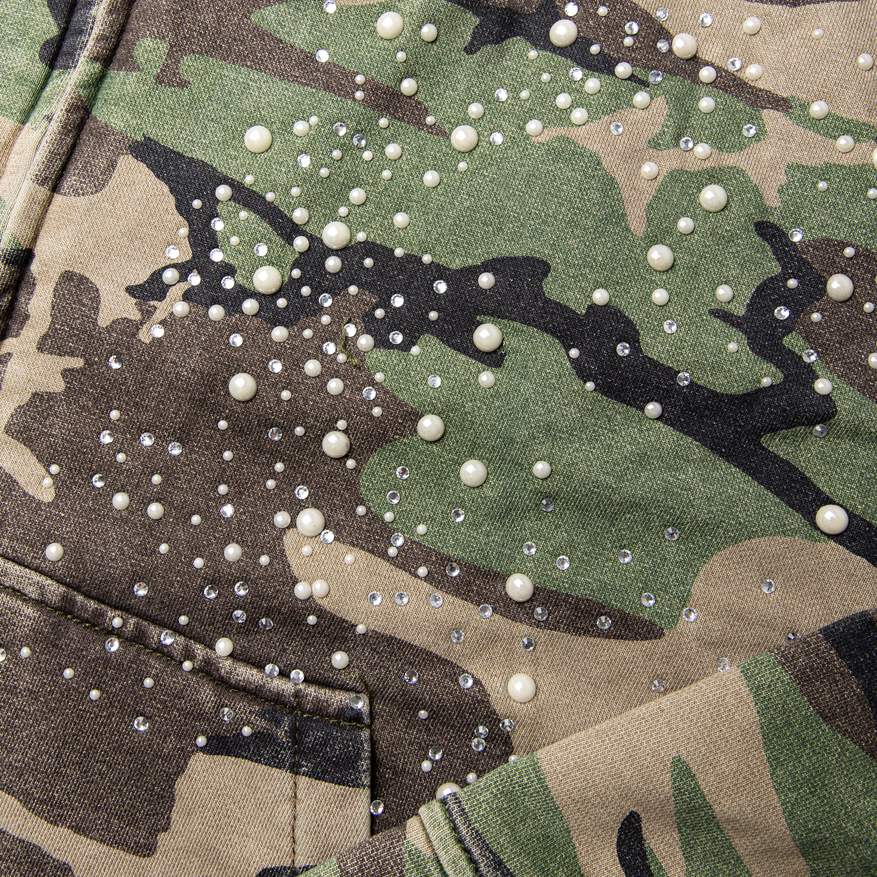 A heavyweight French terry hoodie with a relaxed, cropped fit. Full-zip front, drop shoulders, and split kangaroo pockets. Covered in hand-applied pearls and crystals, each piece is one of one.